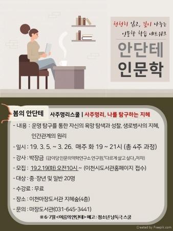 이천 마장도서관은 지난해 큰 성과를 이룬 "당신에게 권하는 인문학"사업의 확장을 위하고, 천천히 읽고 깊이 나누는 학습 네트워크 결성을 위해 2019년"안단테 인문학"사업을 새롭게 추진한다. "당신에게 권하는 인문학"은 좀더 다양하고 풍성한 주제로 매월 만나게 되고, 그와 더불어 인문학적 시대정신을 추구하고 시민 개개인의 성장하는 삶을 도모하기 위한 4개의 인문학 심화과정이 개설된다.