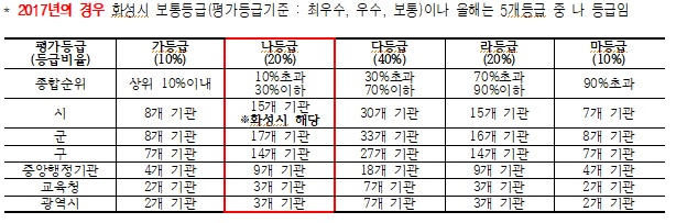 행정안전부가 지난해 2017.10.1. ~ 2018.9.30. 민원을 토대로 총 304개 기관, 중앙행정기관(44), 시도교육청(17), 광역지자체(17) 기초지자체(226)중 화성시를 나등급 88.12점(나등급 평균 : 79.02점)으로 종합 평가했다.