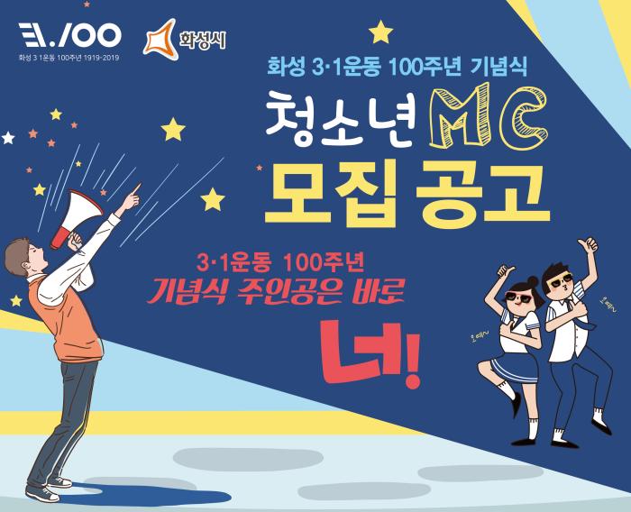 화성시(시장 서철모)가 3.1운동 및 화성 제암·고주리 학살사건 100주년을 맞아 독립운동의 역사적 가치와 애국정신을 많은 시민과 함께 기억하고 널리 알리며 기념사업과 홍보활동에 각계각층의 시민이 직접 참여하는 분위기 조성키 위해 화성 3.1운동 100주년 기념식 '청소년 MC' 공개 모집한다.