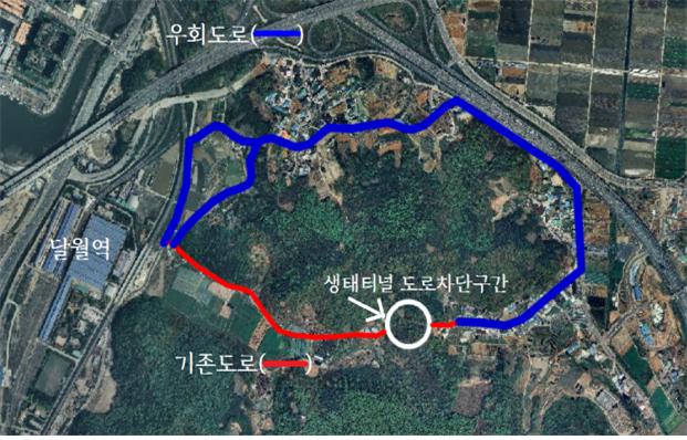 이 도로는 ‘달월역 진입도로 확장공사’ 사업구간(1.041km) 중 생태터널 조성 구간(L=46m, B=12m)이다. 생태터널 조성 시 기존도로(B=4m) 통행에 안전 위험요소가 많아 부득이 통행을 제한하기로 결정했다.