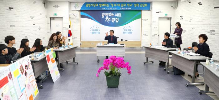 광명시(시장 박승원)는 지난 25일 오전 광명시청 중회의실에서 청․와․대 꿈의 학교 학생들과 만나 광명시 정책제안 간담회를 열었다.