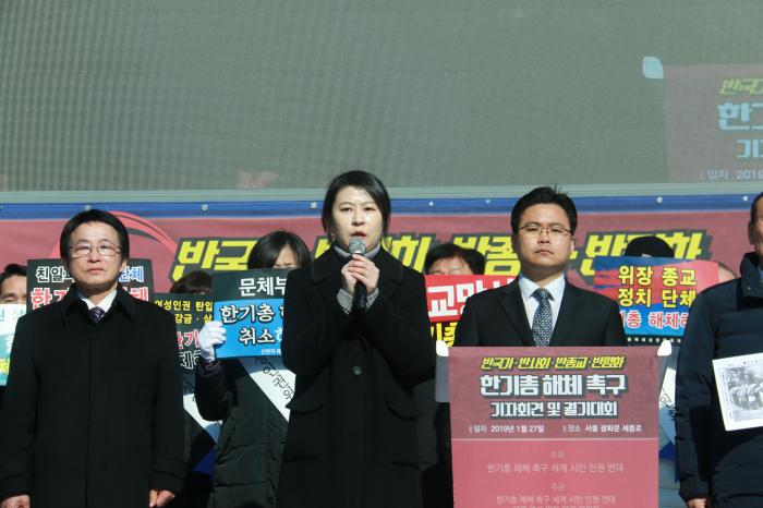 특히 세계여성평화인권위 구현진 부위원장은 기자회견에서 “한기총은, 개종 교육을 받다가 숨진 故 구지인 씨의 넋을 위로하고자 전국에 분향소를 설치한 우리 단체의 협력단체 IWPG를 경찰에 고소‧고발하여 망자의 명예를 두번이나 훼손시키고 무혐의 판결에도 사과하지 않는 등 비양심 비도덕적 행태를 저질렀다”며 “현 정부는 더 이상 구지인 씨와 같은 희생자가 나오지 않도록 오늘 이 현장의 소리에 귀를 기울여야 할 것이며 반드시 강제개종 종교 차별 금지법인 구지인법을 제정해야”한다고 촉구했다.