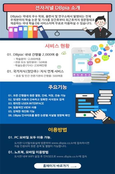 또한, 개인 노트북 또는 스마트폰으로 도서관 내 무선인터넷을 이용해 DBpia에 접속하면 자동으로 인증돼 도서관 어느 곳에서나 모든 자료를 열람하고 다운로드할 수 있다.