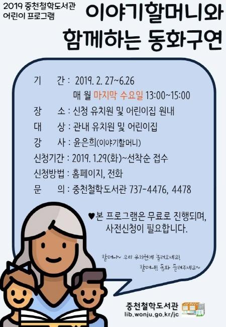 중천철학도서관은 오는 2월 27일을 시작으로 매월 마지막 주 수요일 오후 1시부터 3시까지 ‘이야기할머니와 함께하는 동화구연’을 운영한다.