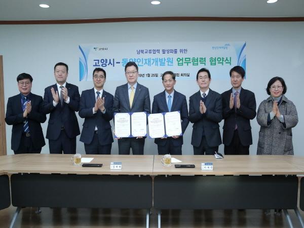 고양시는 지난 25일 남북교류협력 활성화를 위해 동양인재개발원과 업무협력 협약를 체결했다. 시청 ‘열린 회의실’에서 가진 이날 체결식에는 이재준 고양시장, 김태현 동양인재개발원장, 동양생명보험 교육팀장 등 관계자 10여 명이 참석했다.