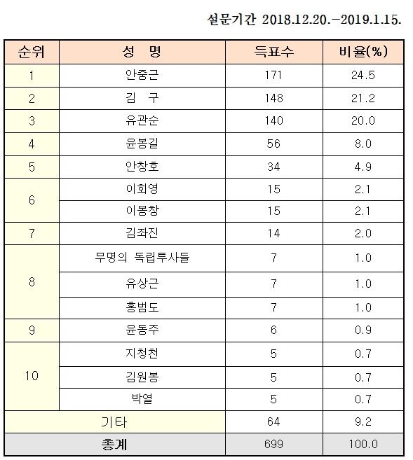 이어 청산리전투를 이끈 김좌진 장군이 7위, 무명의 독립투사들과 광복을 하루 앞두고 옥중 순국한 한인애국단원 유상근 선생, 만주 대한독립군 총사령관 홍범도 장군이 공동 8위였다.