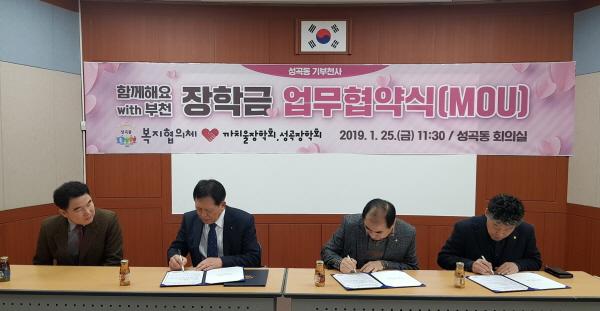 부천시 성곡동 행정복지센터는 지난 25일 까치울장학회 및 성곡장학회와 업무협약식을 진행했다. 협약식에는 이계환 까치울장학회장과 김종인 성곡장학회장 및 김태동 성곡동장, 강연희 성곡동복지협의체 위원장 등 10명이 참석했다.