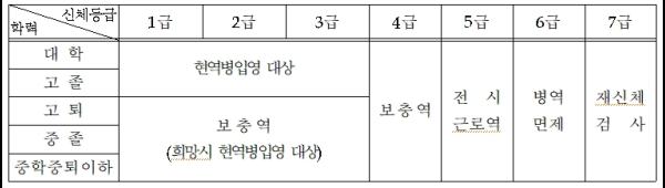 병역처분은 신체등급, 학력 등을 종합적으로 고려해 판정한다.