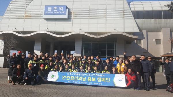 파주시 자율방재단이 설 명절을 앞두고 지난 25일 오후 2시 안전문화 확산을 위한 안전점검의 날 거리 캠페인 및 설 연휴대비 전통시장 합동 안전점검에 앞장섰다.
