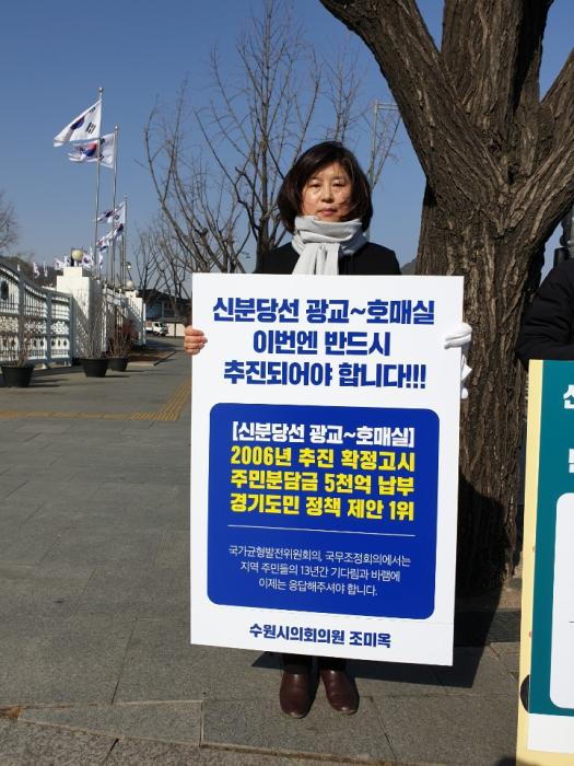 신분당선 연장 2단계 사업이 29일 국무회의에서 발표할 예비타당성 면제대상사업에서 제외될 것이라는 언론보도와 함께 논란이 가중되고 있는 가운데 수원시의회 조미옥 의원과 서수원 지역 주민대표들이 피켓시위에 나섰다.