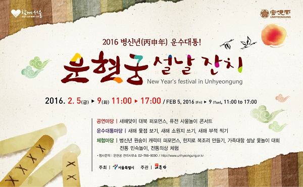 서울시는 운현궁에서 2월 5일(금)부터 2월 9일(화)까지 민족의 대 명절 설을 맞아 시민과 관람객의 만복을 기원하는 2016 병신년(丙申年) 운수대통 ‘운현궁 설날 잔치’를 개최한다.