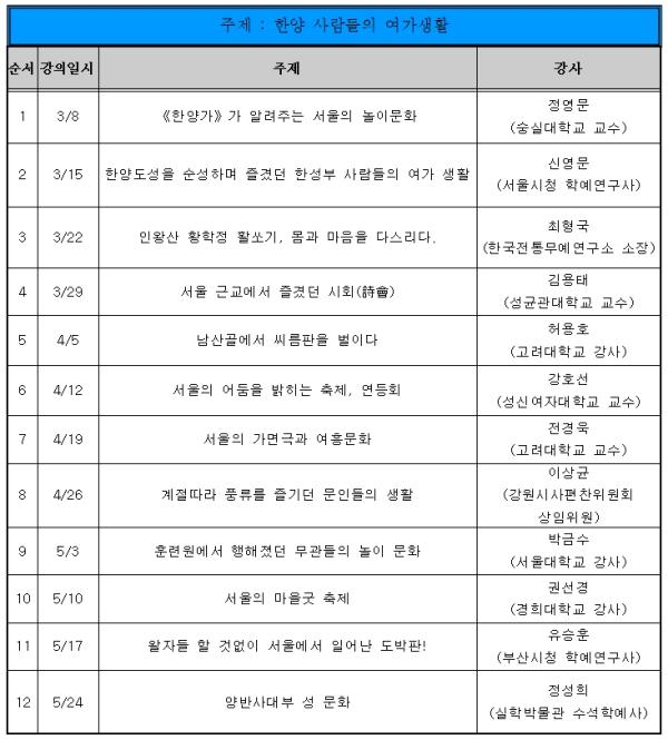 이번 강의는 오는 3월 8일, 정영문 숭실대 교수의 ‘《한양가》가 알려주는 서울의 놀이문화’라는 주제의 강의를 시작으로 매주 금요일 A반, B반으로 나누어 각 50명씩, 총 100명의 수강인원을 대상으로 12주간 진행된다.