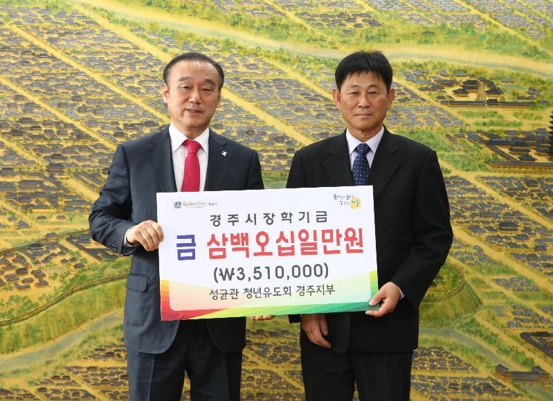 성균관 청년유도회 경주지부(지부장:이석태)는 26일 351만원을 지역 후학 양성을 위해 경주시장학회에 장학금으로 기탁했다.우리 전통문화의 계승 발전과 새로운 유교문화 구현에 선도적 역할을 수행하는 성균관 청년유도회 경주지부는 신년교례회 및 회장단 이·취임식에서 경주지역의 교육발전을 위해 십시일반 모아 장학금으로 전달했다.이석태 회장은 “지역의 어른들이 솔선하여 경주의 인재들을 육성하고 지원하는데 보탬이 되기를 바라며, 이를 계기로 전 시민이 동참하여 우수한 인재들이 경제적인 어려움 없이 학업을 유지하기를 바란다”며 “경주가 교육 중심도시로 우뚝 설 수 있도록 앞으로도 지원을 아끼지 않겠다”고 말했다.최양식 경주시장은 “소중한 장학금을 기탁해준 성균관 청년유도회들께 감사를 전하며, 이러한 어른들의 따뜻한 마음이 있기에 경주지역의 자녀들이 더욱 힘을 얻어 꿈을 이뤄 나갈 것”이라고 했다.