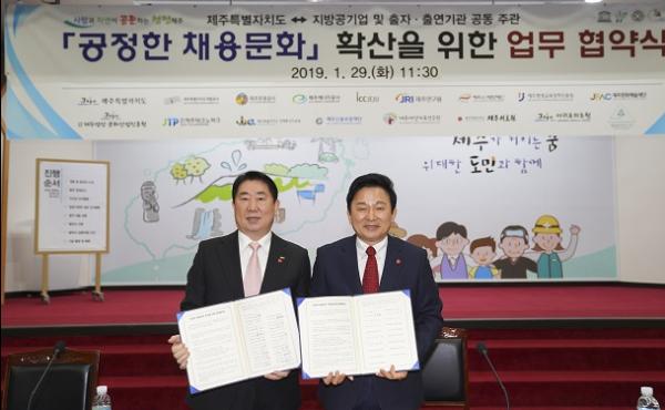 제주도와 도내 공공기관은 29일 오전 11시 30분, 제주도청 4층 탐라홀에서 공정한 채용문화 확산을 위한 ‘공공기관 직원 통합 채용시험 공동실시’ 업무협약을 체결했다.