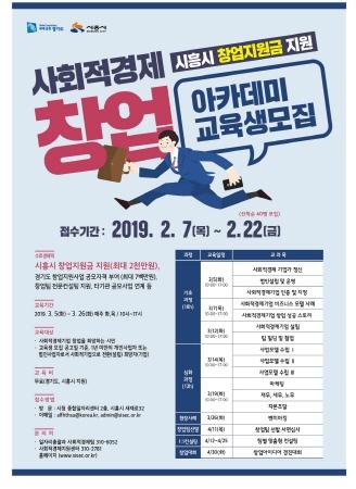 시흥시는 사회적 기업 창업을 통해 새로운 일자리 창출 기반을 마련하기 위해 "창업아카데미→창업경진대회→창업지원금 지원"사업을 단계적으로 진행한다. 시흥시는 창업비용, 창업교육, 멘토링 등을 지원한다.