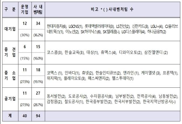 지난 해 신설된 본 사업은 사내벤처 제도를 도입·운영하고 있는 기업 중 우수한 40개사를 운영기업으로 선정하고, 민간 운영기업과의 협력을 통해 총 94개팀의 유망 창업팀을 지원했다. 올해 본격적인 사내벤처 창업기업의 육성을 위해 운영기업 Pool을 확대할 계획이다.