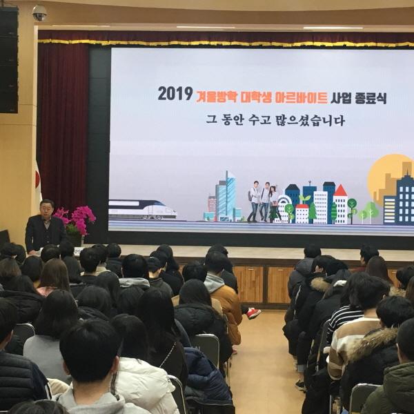 광명시는 지난 29일 겨울방학 동안 시청을 비롯 도서관, 동 주민센터, 복지관 등에서 지난 2일부터 근무하고 있는 아르바이트 대학생 200명과 사업 종료식 및 간담회를 개최했다.