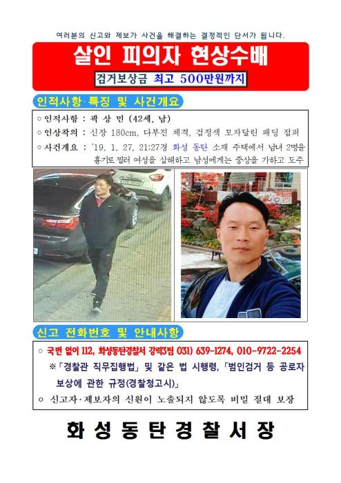 화성동탄경찰서(서장 김병록)는 27일 경기도 화성시 동탄 소재 주택에서 남녀 2명을 흉기로 찔러 여성을 살해하고 남성에게는 중상을 가한 혐의로 피의자 곽상민(42세, 남)을 공개수배했다.