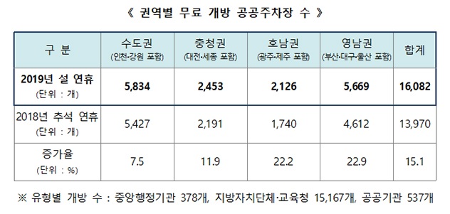 지난 30일 행정안전부에 따르면 연휴 기간 무료개방하는 공공주차장은 전국 1만 6000여곳이다. 중앙행정기관, 지방자치단체, 교육청, 학교 등은 물론 병무청 등 일부 행정기관도 주차장 개방에 동참한다.