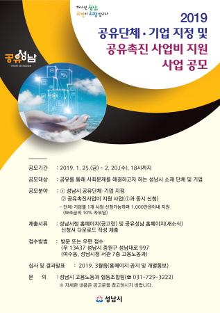 성남시는 공간이나 물건, 정보, 재능, 경험 등을 나눠 시민 편의를 제공하는 기업에 최대 1000만원의 공유촉진 사업비를 지원한다. 시는 오는 2월 20일까지 공유 촉진 사업을 공모한다.