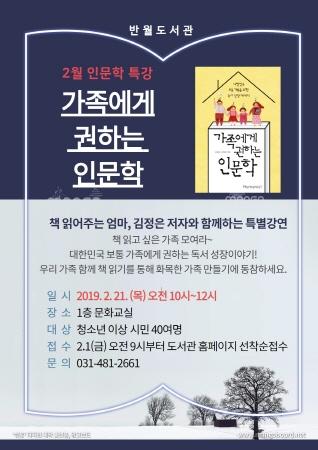 안산시 반월도서관은 오는 2월 21일 오전 10시에 김정은 작가를 초청해 2월 인문학 특강 ‘가족에게 권하는 인문학’을 주제로 강연을 진행한다.