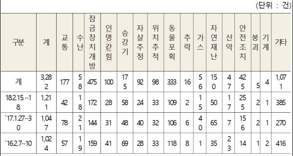 구조활동은 총3,282건으로 잠금장치 개방 475건, 안전조치 425건, 동물포획 333건, 승강기 안전사고 175건, 자연재난 150건, 인명 갇힘 100건, 위치추적 98건, 자살추정 92건, 수난 58건, 기타1,071 등의 순이었다.