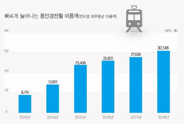 용인경전철이 이용객 하루 평균 3만명, 연간 1100만명 시대를 열었다.