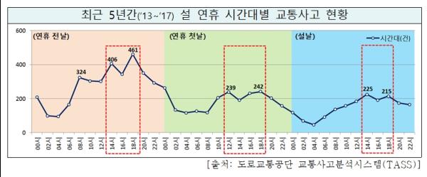 사고 현황을 시간대별로 자세히 분석해 보면 연휴 전날과 첫날은 오후 6시 전후로 가장 많이 발생했고, 설날에는 오후 2시에 가장 많았다.