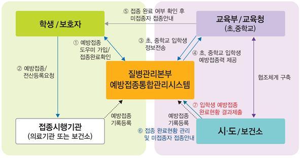 이에 질병관리본부, 교육부, 지방자치단체, 초·중학교가 공동으로 관련 법에 따라 집단생활 하는 학생들의 건강 보호 및 감염병 예방을 위해 미접종자에게 접종을 독려하고, 전산등록이 누락된 예방접종에 대한 전산등록도 완료하도록 안내하고 있다.