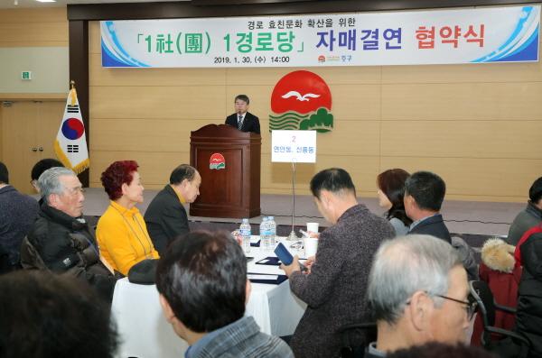 중구는 지난 30일 중구청 월디관 대회의실에서 관내 77개소 경로당 회장과 기업체, 기관, 단체 대표 등 140여명이 참석한 가운데 ‘1사 1경로당 자매결연 협약식’을 개최했다.