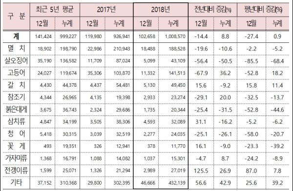 통계청이 지난달 31일 공표한 어업생산통계에 따르면, 2018년 연근해 어업생산량은 총 101만 톤으로, 2017년에 비해 8.8% 증가했다.