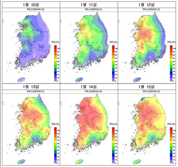 이번 고농도는 중국 산둥반도 및 북부지역에 위치한 고기압권 영향으로 인한 대기정체 상태에서 1월 10∼11일 1차 유입된 후, 13일 이후 북서풍 기류로 강한 국외 오염물질이 2차로 추가 유입되는 등 매우 이례적인 상황에 기인한 것으로 분석됐다.