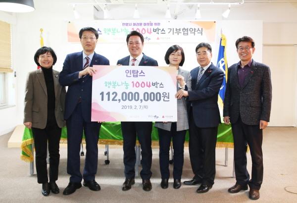 안양시가 7일 인탑스·경기사회복지공동모금회 안양시나눔운동본부 2개 기관과 ‘행복나눔 1004박스’ 기부협약을 체결했다.