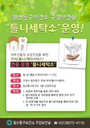 의치를 사용하고 있는 일산동구 관내 어르신이라면 누구나 일산동구보건소 구강보건실로에 평일 오전 방문하면 청결한 의치관리서비스를 받을 수 있다.