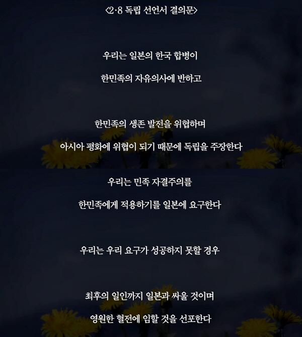 '2.8독립선언서'는 같은 해 2월1일 만주 지린에서 발표됐던 ‘대한독립선언’의 영향을 받았는데 대한독립선언서를 기초한 조소앙 선생이 도쿄에 파견돼 유학생들을 지도해 선언서 작성이 이뤄졌다. 당시 와세다 대학교 학생이었던 이광수가 초안을 작성했다. 2.8독립선언의 주체들은 국한문체의 선언문을 영어와 일본어로 번역해 세계에 알리고자 했는데, 아쉽게도 영어·일본어 번역본은 전해지지 않고 있다.