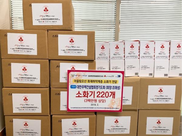 오산시는 11일 대한주택건설협회 경기도회에서 2019년 첫 번째 사회공헌 사업으로 오산시 화재취약 저소득 계층에게 소화기 220개를 기탁했다고 밝혔다.