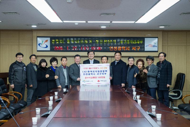우리 고유의 명절 설을 맞이하여 (사)한국외식업중앙회 인천광역시지회 서구지부장 조귀정(희래등 대표)은 사무국장 및 운영위원들과 함께 지난 27일 불우이웃돕기 성금으로 온누리상품권 백만원을 서구청에 기탁했다.