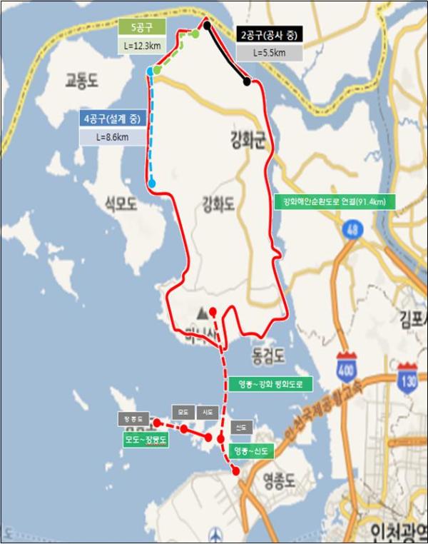 강화해안순환도로 중 유일하게 미개설 구간인 강화 북단 4공구, 5공구구간을 금년 6월말 개통 예정인 2공구구간과 연속성을 유지코자 이번 계획에 구간 연장, 사업비 확대 및 국비확보를 이끌어 내기 위해 박남춘 인천광역시장은 물론 인천시 관계자들이 중앙부처를 방문 적극적으로 협의 건의한 결과 큰 성과를 얻게 됐다..