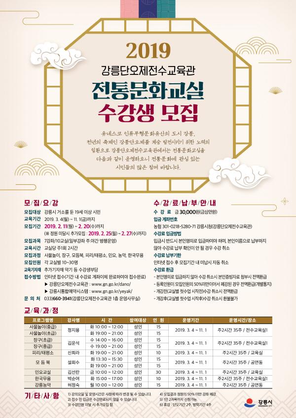 강릉단오제전수교육관은 11일부터 오는 20일까지 2019년도 전통문화교실 프로그램 수강생을 강릉시통합예약시스템을 통해 모집한다.