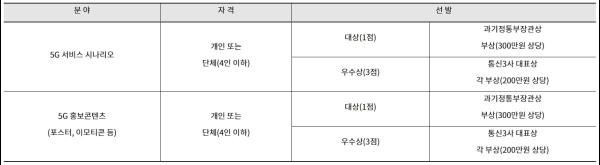 각 분야 별대상 1점과 우수상 3점을 선발하고, 대상은 과기정통부장관상, 우수상은 통신3사에서 상장과 함께 부상을 수여한다.