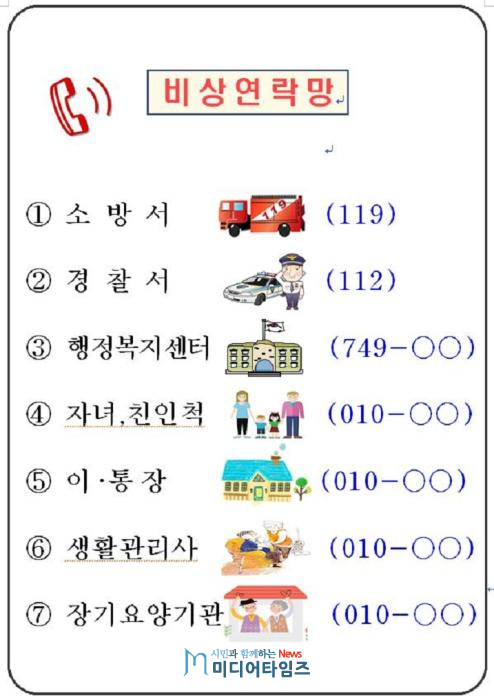 비상연락망은 어르신들이 쉽게 알아볼 수 있도록 큰 글씨에 그림을 함께 넣어 소방서, 파출소, 자녀, 친인척, 이통장 등의 전화번호를 기재할 수 있도록 만들 예정이다.