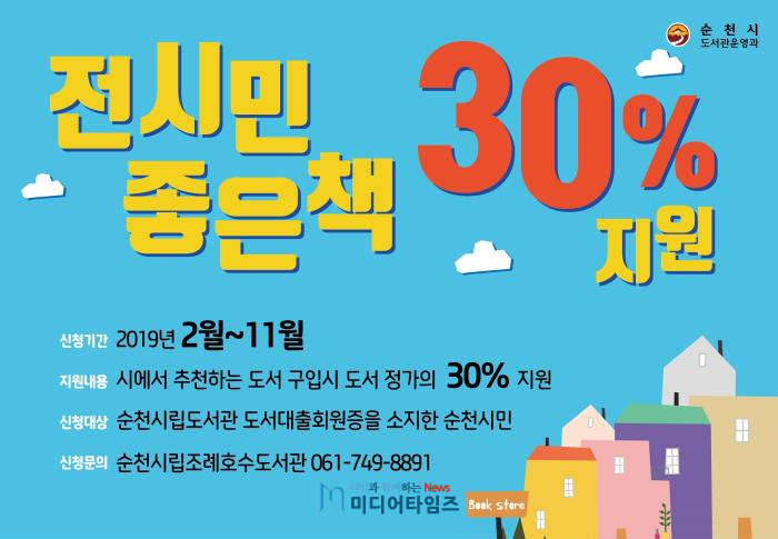 ‘전 시민 좋은 책 도서 지원 사업’은 순천시립도서관 도서대출 회원증을 소지한 순천 시민이면 누구나 지정된 서점에서 추천 도서를 30% 할인된 가격으로 구입할 수 있는 사업으로 2014년부터 시작해 이 사업을 통해 책을 구입하는 시민들이 매년 증가하고 있으며 도서구입량도 매년 늘어나고 있어 독서효과가 입증된 독서권장 정책이다.