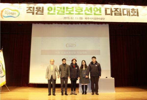 파주시시설관리공단은 지난 11일 ‘파주시시설관리공단 직원 인권보호선언 다짐대회’를 개최했다. 임원이나 관리자, 상급자들의 직장갑질을 근절해 공단 내 인권침해적 요인을 없애고, 인권친화적 조직문화 정립에 앞장서기 위한 이 행사에는 중간관리자인 팀장 대표와 노조위원장도 함께 했다.
