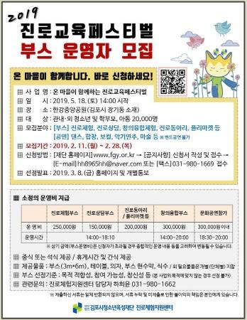 김포시청소년육성재단 진로체험지원센터에서는 지난 11일부터 오는 28일까지 ‘2019 제3회 온 마을이 함께하는 진로교육페스티벌’의 부스 및 문화공연을 함께 할 기관·단체 및 개인을 모집한다고 밝혔다.