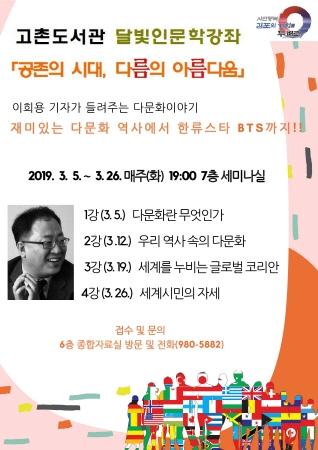 달빛인문학의 첫 번째 문을 여는 주제는 ‘다문화’로 ‘세계시민 교과서’의 저자 이희용 기자를 초빙해 ‘재미있는 다문화 역사부터 한류스타 방탄소년단까지’라는 부제로 다양한 문화의 공존시대에 사는 우리에게 필요한 세계시민의 자세를 다문화의 역사와 재미있는 사례를 통해 탐구해보는 시간을 가질 예정이다.