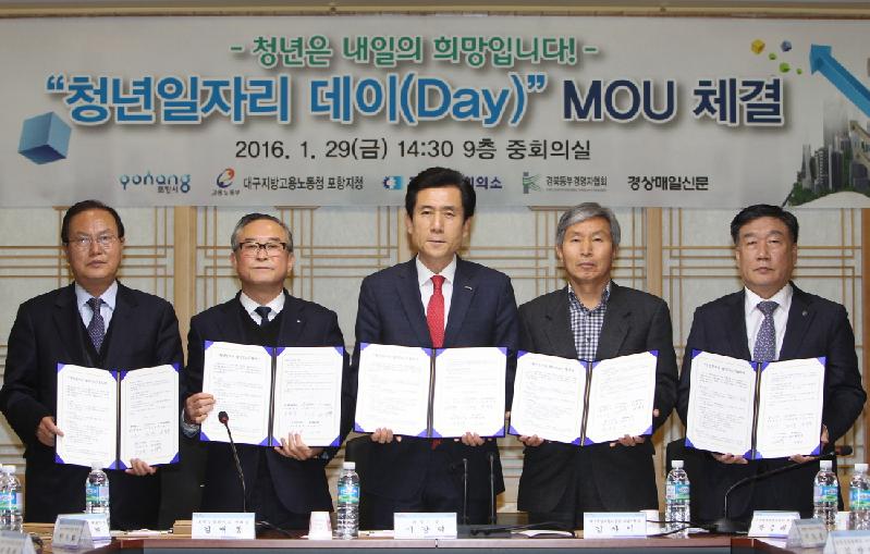 최근 청년 실업률이 9.2%를 넘어서고 실제 체감 실업률이 20%로 접어드는 등 심각한 사회문제로 대두되는 가운데 청년일자리 창출을 위한 ‘청년일자리 데이(Day) MOU체결식’이 지난29일 포항시청 중회의실에서 열렸다. 이날 포항시를 비롯한 대구지방고용노동청 포항지청, 포항상공회의소, 경북동부경영자협회, 경상매일신문 등은 ‘청년일자리 데이(Day)’ 운영을 위한 업무협약을 맺고, 기관·단체간 긴밀한 협력을 통해 양질의 청년 일자리 창출에 협조하기로 했다. 이번 협약에 따라 △매월 29일을 ‘청년일자리 데이(Day)’로 운영하고 △기업체 청년고용 적극 동참 분위기 조성 공동 노력 △청년 구직자들을 위한 일자리창출에 관한 협력 △고졸채용 활성화 및 고졸취업자에 대한 지원 협력 △기관∙단체 실무협의회 구성 운영 △지역학교 및 직업 훈련기관과 협력 확대 등을 함께 추진하기로 했다. 이강덕 포항시장은 “포항의 미래 주역인 청년들에게 좋은 일자리를 제공하고, 구인 기관에는 필요한 인력 정보를 제공해 취업 증진과 지역 고용 증대에 기여 할 수 있도록 지역 기업체에서도 청년고용 증대에 적극 나서 주기를 바란다”며 “시에서도 일자리 창출을 통한 시민 행복에 앞장서겠다”고 말했다. // 심후보 기자 (sky626201@naver.com)