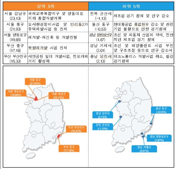 최고 변동 지역은 서울 강남구이고, 이어서 서울 중구, 서울 영등포구, 부산 중구, 부산 부산진구 순이며, 최저 변동 지역은 전북 군산시이고, 울산 동구, 경남 창원시 성산구, 경남 거제시, 충남 당진시 순으로 낮은 변동률을 보였다.