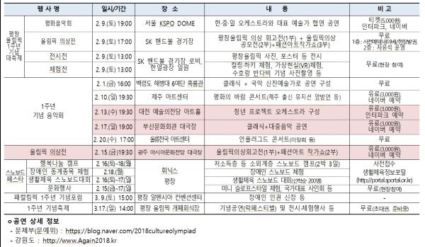 문화체육관광부는 한국문화예술위원회와 함께 ‘2018 평창 동계올림픽대회 및 동계패럴림픽 성공 개최 1주년 기념 대축제’ 지역행사로 대전, 광주, 부산에서 기념음악회와 패션문화행사를 진행한다.