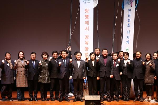 광명시는 12일 광명시민회관에서 4차 산업혁명시대 새로운 농정혁신 전략인 공동체 중심의 공유농업을 올해부터 본격적으로 추진하기 위한 ‘공유농업 선포식’을 개최했다.