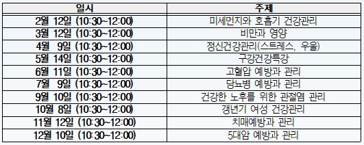 시민건강특강은 2월~12월(총 10회, 매월 둘째주 화요일 10:30~12:00)열린다.